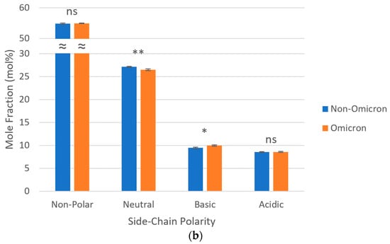 As for side-chain polarities, in all SARS-CoV-2 lineages, most amino acids (~55 mol%) were non-polar; among the polar amino acids, a predominance of neutral over charged (basic and acidic) was observed. When considered as a group, omicron variants presented a lower proportion of neutral polar amino acids (26.48 vs. 27.12 mol%) and a higher proportion of basic polar amino acids (9.99 vs. 9.47 mol%), both statistically significant, in relation to non-omicron variants. No statistically significant differences were observed regarding the proportions of non-polar and acidic polar amino acids between these two groups of SARS-CoV-2 variants (Figure 2).