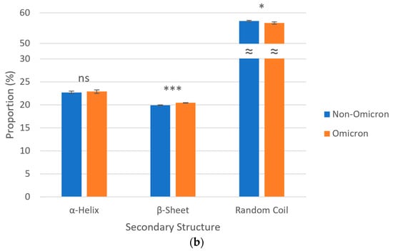Regarding secondary structures, S proteins of all SARS-CoV-2 lineages were predicted to be predominantly composed of random coils (~57%), followed by α-helices (~23%) and β-sheets (~20%). Analyzing the data in a grouped manner, omicron variants revealed, in a statistically significant way, a higher proportion of β-sheets (20.45 vs. 19.94%) and a lower proportion of random coils (56.66 vs. 57.34%) when compared to non-omicron variants. No statistically significant difference was noted in relation the proportions of α-helices between these two groups of SARS-CoV-2 variants (Figure 3).