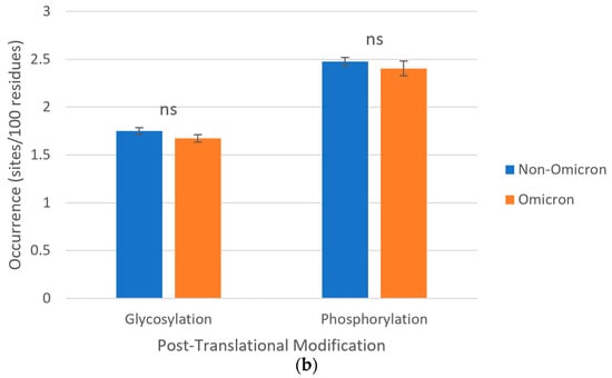 About post-translational modifications, in all S protein sequences studied, consensus patterns were identified for N-glycosylations and phosphorylations by PKA/G, PKC, CK2, and TK. Phosphorylations were collectively predominant over glycosylations in all SARS-CoV-2 lineages, but no statistically significant differences were observed for the occurrences of both groups of post-translational modifications between omicron (1.67 and 2.40 sites/100 amino acids, respectively) and non-omicron (1.75 and 2.48 sites/per 100 amino acids, respectively) variants (Figure 4). Both groups of post-translational modifications occurred along the two subunits of the protein (Figures S1 and S2).