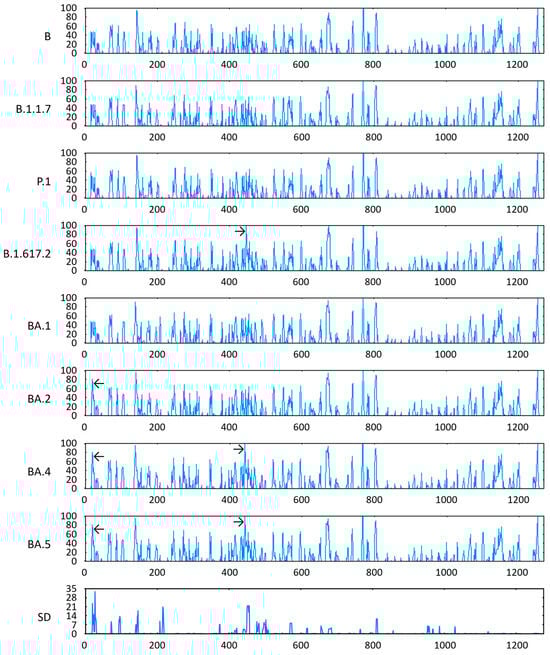 Concerning antigenic propensities, the VOCs BA.2, BA.4, and BA.5 presented relatively pronounced scores in the NTD of their respective S proteins, close to amino acid position 27. Furthermore, the last two variants, together with the VOC B.1.617.2, also demonstrated a high relative value for this parameter in the RBD of their respective S proteins, around amino acid position 452. These were precisely the positions with the highest SD of Parker antigenicity (Figure 5).