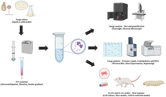 EVs—Fungi culture isolates EVs using several methods, such as ultracentrifugation, filtration, or density gradient. Then, the EVs are analyzed and can be studied in vitro or in vivo. Created with BioRender.com.