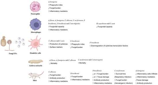 A variety of in vitro assays show the immunomodulatory effects of fungal EVs. Neutrophils are the first line of immune defense recruited to the tissue against some fungal pathogens []. In A. fumigatus, the interaction of mouse bone-marrow-derived neutrophils with EVs allowed for an increase in the phagocytic index and reduction in fungal burden in the fungal challenge, associated with an increase in the production of TNF-α and IL-1β cytokines []. However, A. fumigatus EVs could not induce the release of neutrophil extracellular traps by human neutrophils, nor the cytokine production by human peripheral blood mononuclear cells [].