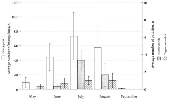 Average number of collected Culex pipiens females (left axis), with the average number of mosquitoes infected with Haemosporida and Trypanosomatida parasites (right axis) during the warm season in 2021–2023. Average ± standard error.