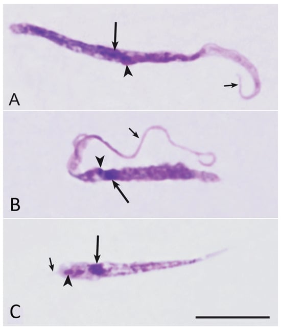 Trypanosomatids found in Culex pipiens midgut preparations: (A)—Trypanosoma culicavium (GenBank No. PP946100); (B)—Trypanosoma trinaperronei (PP946104); (C)—monoxenous trypanosomatid (PP948731). Long arrows—parasite nuclei; arrowheads—kinetoplast; short arrows—free flagellum. Scale bar = 10 µm.