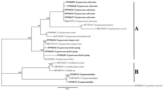 Bayesian phylogenetic tree of Trypanosoma (A) and other Trypanosomatidae (B) using fragments of 18S rRNA. The tree was rooted using Cryptobia catostomi. The Genbank accession numbers of samples obtained during this investigation are written in bold text.