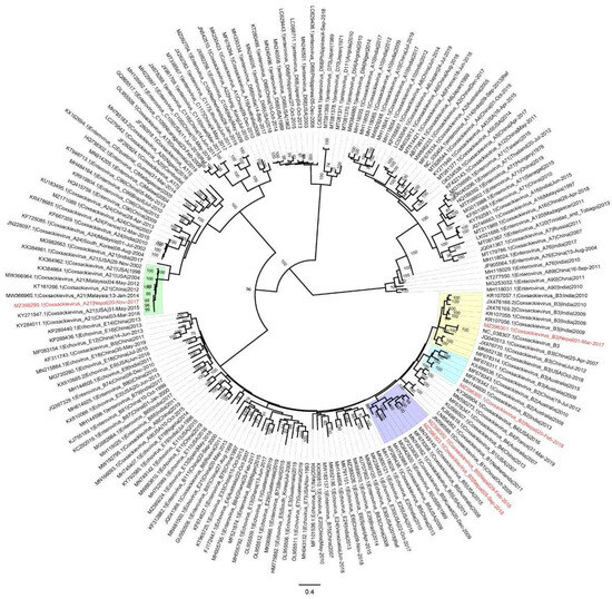 Maximum likelihood tree of 180 EV complete coding sequences (6464–6657 nt) including 175 sequences from GenBank (black) and 5 sequences obtained from this study (red). Only bootstrap values above 70 are shown. CV A21, B2, B3 and B5 sequences are located in green, blue, yellow and purple areas, respectively.
