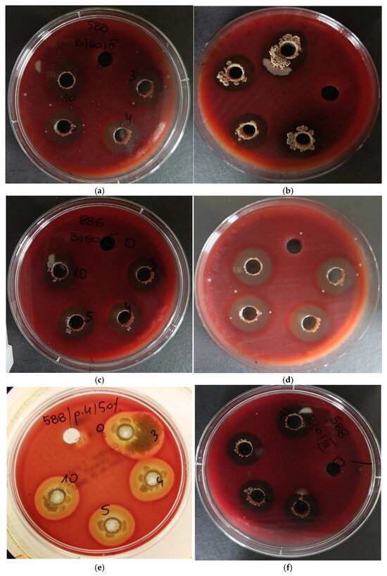 Observed ‘halo’ effects with a visible zone of growth inhibition against strains belonging to the P. larvae species. (a–f) Tests were performed using the well diffusion method according to EUCAST guidelines with modifications due to the specific bacteria used. (a,c,d,f) Antimicrobial mechanisms are of interest, showing antagonism between the microorganisms used, which may include, for example, the secretion of metabiotics, i.e., metabolites and bacteriocins, called antimicrobial substances or competition for food and growth conditions. (b,e) Impressive bacterial overgrowth of beneficial microorganisms is also observed, which takes away the growth capacity of pathogenic cells and even leads to lysis of pathogenic cells.