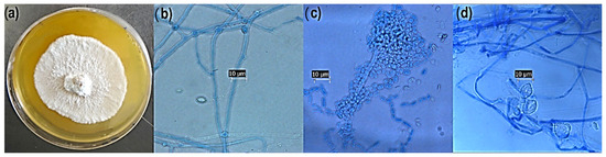 The morphological characteristics of monosporic cultures were observed. Microcultures were prepared in Sabouraud dextrose agar (SDA), incubated at 27 °C, and observed after 5 and 12 days with a Leica DM 500 microscope (Danaher company, Wasshington, DC, USA) at 100×. Micrographs of the mycelia and the morphology of the conidia were obtained.