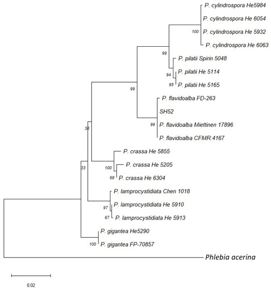 Phylogenetic tree based on concatenation of the ITS and 28S regions. The tree was constructed by the maximum likelihood method (1000 bootstrap replications). Isolate SH52 grouped with the Phlebiopsis flavidoalba clade. The numbers at branch points represent bootstrap support values. Phlebia acerina MY51 was used as the outgroup.