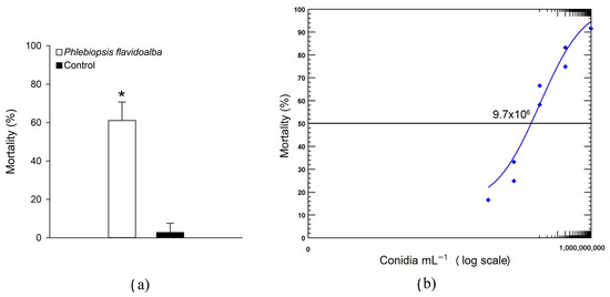 Pathogenicity (a) and virulence (b) of Phlebiopsis flavidoalba toward Praelongorthezia acapulcoa at day 12. The LC50 (9.7 × 106 conidia mL−1) was estimated via probit analysis. The asterisk above the bar represents a significant difference according to Student’s t test (p < 0.001).
