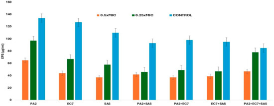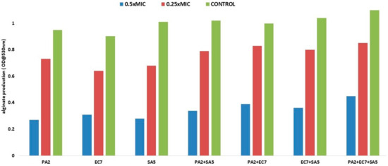 3.5. Effect of Sub-MICs on Inhibition of Biofilm in Mono and Mixed Culture