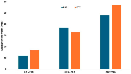 2.11. Effect on Exopolysaccharides (EPS) and Swarming Motility