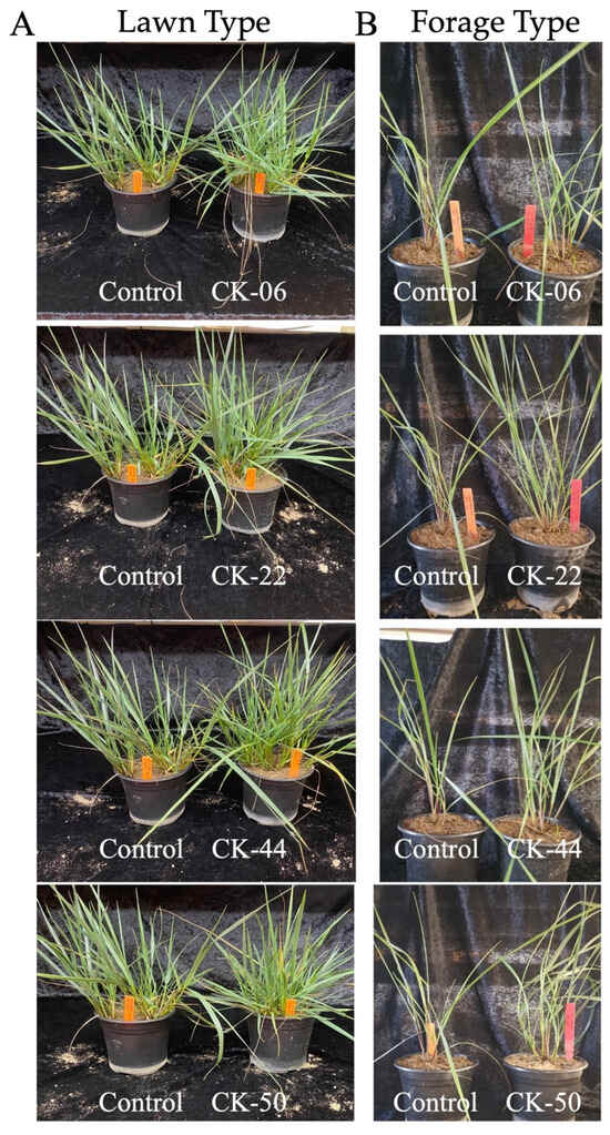 Given these isolates’ promising plant growth-promoting activities in Arabidopsis, we anticipate that our research will significantly benefit for crop production. To explore this potential, we conducted a study to test the growth promotion of four isolates (CK-06, CK-22, CK-44, and CK-50) on two tall fescue varieties: a lawn-type tall fescue blend and an endophyte-free forage-type tall fescue—Armory. Tall fescue (Festuca arundinacea Schreb.), a cool-season perennial grass, is used globally as an essential forage and turf grass. Natural populations are distributed throughout temperate and cool climates of Europe, North–West Africa, North America, and West and Central Asia. However, tall fescue accessions have several genetic variations []. In the late 1970s, tall fescue was discovered as a natural host of fungal endophytes, which produce alkaloids in plants that are toxic to grazing animals []. In cattle, tall fescue toxicosis causes decreased milk production, birth weight, pregnancy rate, serum prolactin levels, and an increased respiration rate. Researchers have tried to create endophyte-free tall fescue varieties to avoid this toxicity []. However, in plants, endophytes are associated with several benefits, such as plant growth and development and mitigated environmental stress. Therefore, the survival rate of endophyte-infected tall fescue is better than that of endophyte-free tall fescues. Endophyte-infected tall fescue shows improved seedling survival, insect and nematode resistance, drought resistance, improved nitrogen assimilation, and higher seed set []. Using plant growth-promoting rhizobacteria in lawn-type tall fescue and endophyte-free forage-type tall fescue could alleviate the effect of endophyte absence and promote the growth and development of both varieties. Promoting PGPR to be used as biofertilizers promotes plant health and improves soil health.