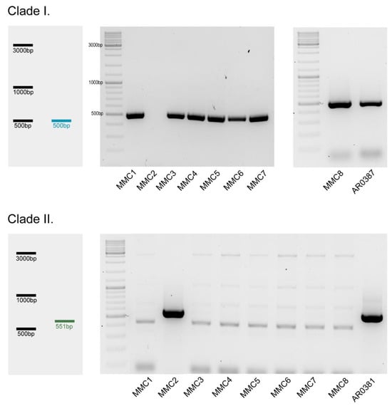 Clade identification. Schematic images of the expected clade I and clade II-specific fragment sizes, compared to the agarose gels, containing the clade-specific PCR fragments of the unclassified strains (MMC1–8) and the already classified clinical isolates (AR0387, AR0381).