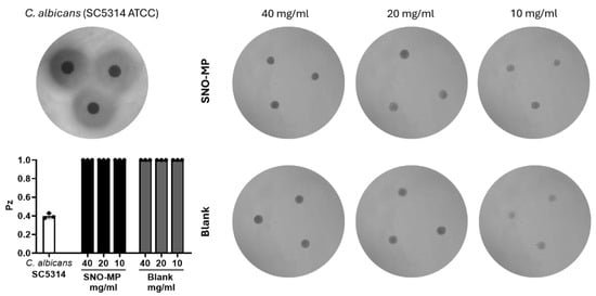 Hemolytic activity was assessed using 5% sheep blood agar medium (Colorado Serum Company, Denver, CO, USA), and enzymatic activity was evaluated on 90 mm Petri dishes using the Pz value (Pz = A/B), where A is the diameter of the colony and B is the sum of the colony’s and the halo’s diameters. The test was performed using mSNO nanoparticles at concentrations of 40, 20, and 10 mg/mL. Candida albicans (ATCC SC5314) suspension of 1 × 106 yeasts/mL served as the positive control. Inoculations of 5 µL were performed in triplicate and incubated at 37 °C for 48 h. Hemolytic activity was categorized as follows: Pz = 1 (negative), 0.70–0.99 (low), 0.40–0.69 (moderate), and <0.39 (high).