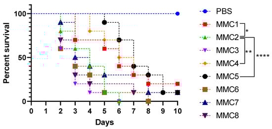 Galleria mellonella survival rates following infection with Candida auris. G. mellonella were infected with a lethal inoculum of C. auris yeasts, and survival was monitored for 10 days. Infection with the clade 2 strain, MMC2, resulted in a significantly higher mortality rate compared to the clade 1 isolates MMC1, 4, and 5. Infection with other clade 1 isolates had no significant survival rates compared to MMC2. Statistical analysis was performed with log-rank Mantel–Cox, * p < 0.05, ** p < 0.01, **** p < 0.0001.