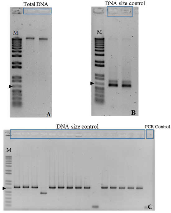 Four DNA extractions were performed on each soil sample. These extractions yielded high-quality DNA, which was checked after electrophoresis in an agarose gel (1.4%) (Figure 2A).