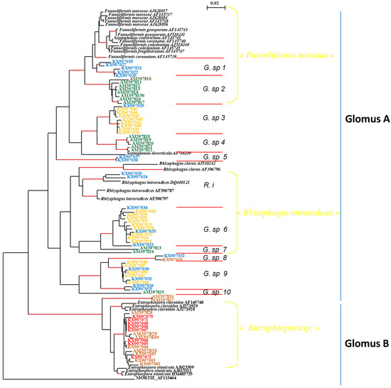 This group consists of sequences from 16 clones of DNA fragments from the three soils studied. Two clone sequences had lineages closely related to R. intraradices (R.i), originating from samples from the moderately saline soil of Ngane. The other sequences (G. sp. 6 and G. sp. 7) were also grouped in this cluster according to their homology.