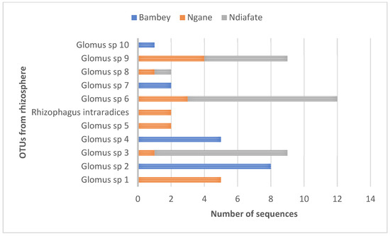 The distribution of OTUs across the three zones (Figure 5) showed that all three zones shared 50 common OTUs. Some OTUs were present in Ngane and Ndiafate soils (G. sp. 3, 6, 8, and 9), which are moderately and high-saline soils, respectively. On the other hand, all OTUs from the low-salinity soil of Bambey (G. sp. 2, 4, 7, and 10) had no phylogenetic similarities with those from the other two soils, as showed in Figure 5. Three specific lineages were recovered only from the moderately saline soil of Ngane (G. sp. 1–5 and R. intraradices).