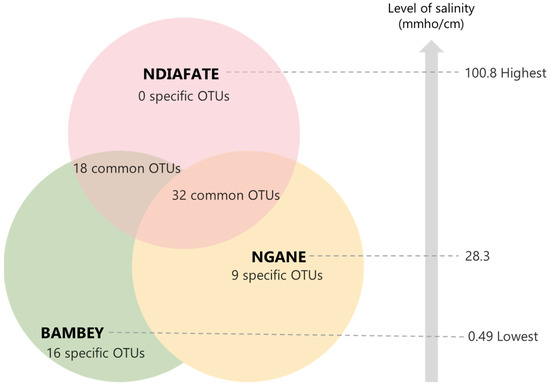 The Bambey region consists of arable land with intensive annual monoculture of peanut (Arachis hypogaea L.) and millet (Pennisetum glaucum (L.) R. Br.) during the rainy season from July to October. No OTUs recorded in the low-salinity soil of Bambey were found in the moderate- and high-salinity soils of Ngane and Ndiafate, respectively. These findings are consistent with previous reports that the AM fungal community is found to be impoverished in species composition in areas of agricultural intensification [58,59,60,61], particularly with a change from crop rotation to monocropping [60].