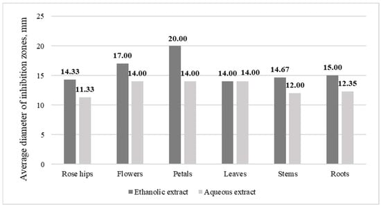 According to the data on the antifungal and antibacterial activity of the various aqueous and ethanolic extracts of the different parts of R. rugosa for microorganisms, it was determined that ethanolic and aqueous extracts of all the tested parts of R. rugosa (rose hips, petals, flowers, leaves, stems, and roots) showed antifungal, antimicrobial activity against Gram-positive and Gram-negative microorganisms and only their spectrum and strength differed.