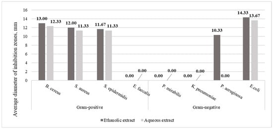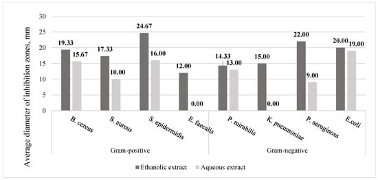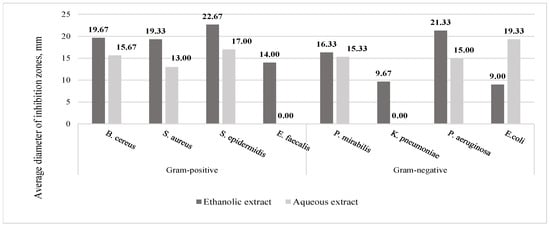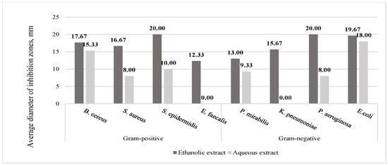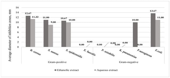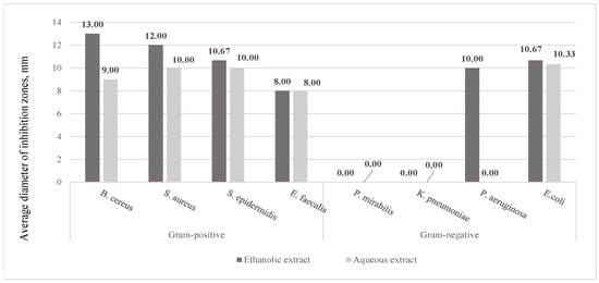 The antimicrobial activity of R. rugosa stems’ ethanolic and aqueous extracts against Gram-positive B. cereus, S. aureus, S. epidermidis, and E. faecalis and Gram-negative E. coli was determined. The ethanolic extracts of R. rugosa stems acted against Gram-negative P. aeruginosa, E. coli. Neither aqueous nor ethanolic extracts of stems had antimicrobial activity against P. mirabilis and K. pneumoniae (Figure 8).