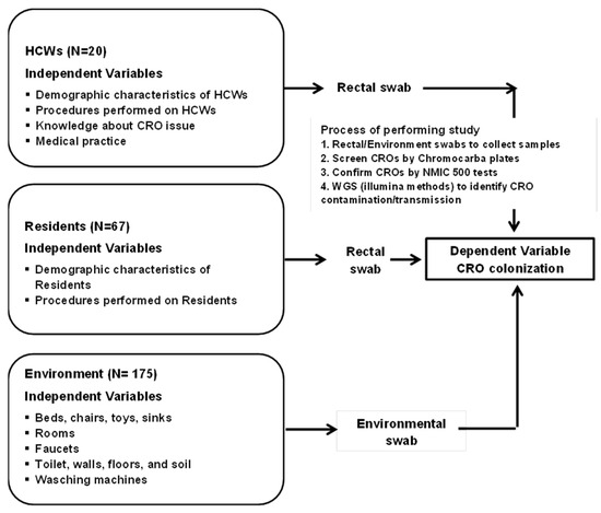 After the data were collected and cleaned, we transferred these data to the SPSS software version 23.0 for analysis. Descriptive statistics were employed to describe the independent variables, including the characteristics related to demography in HCWs and residents, antibiotic use, treatment, medical procedures, the length of hospital stay, the number of hospital admission times related to CRO colonization, and chronic diseases, detected in HCWs and residents. Descriptive statistics were also employed to determine the prevalence of CROs in HCWs, residents, the environment, and risk factors associated with CRO colonization. The adjusted odds ratio with a 95% confidence interval was considered significant with statistical significance at p < 0.05.