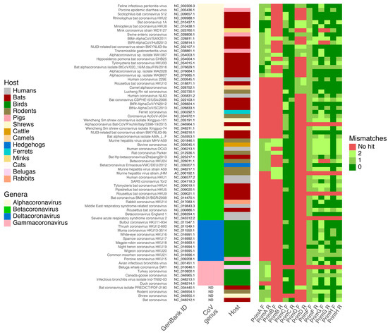 In silico PCR analysis was conducted to test the sensitivity (% of detectable target organisms) and specificity (% of detectable non-target organisms) of designed primers. For the comparison, primers for CoVs PCR detection from studies by Vijgen et al. [20], Watanabe et al. [21], and Holbrook et al. [22] were added to the analysis as controls. The command-line-based tool “primesearch” from the EMBOSS tool kit (version 6.6.0) was used for the in silico PCR. The maximum number of mismatches was set to two. For this analysis, two databases containing CoVs and viral reference genomes were compiled from the NCBI RefSeq database (12 November 2024) [23]. The CoVs reference genomes database contained 74 genome sequences belonging to the Coronaviridae family and was used to test sensitivity, while the viral reference genomes database contained 18,748 available viral genomes (CoVs included) and was implemented for specificity testing. Results were visualized as the heatmap using “ggplot2” package (version 3.5.1) [24].