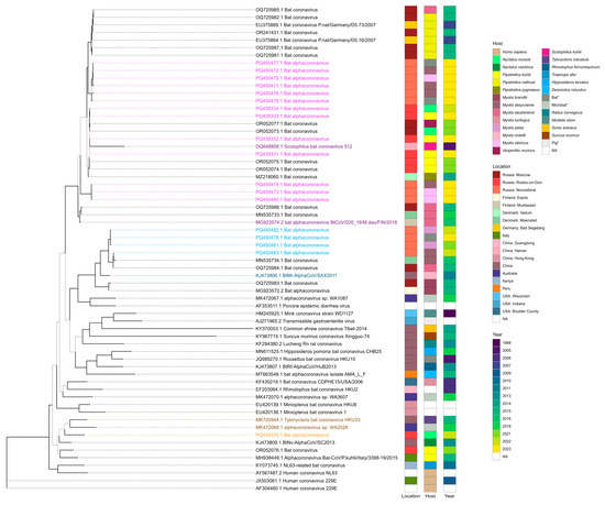 According to the results of the phylogenetic analysis of RdRp sequences, viruses detected in this study appeared in clades with three alphaCoVs subgenuses—Pedacovirus, Myotacoviruses, and Nyctacovirus. Four records from the Rostov region (PQ439331.1, PQ439332.1, PQ439333.1, and PQ439334.1) and nine records from the Novosibirsk region (PQ450477.1, PQ450472.1, PQ450475.1, PQ450471.1, PQ450476.1, PQ450479.1, PQ450474.1, PQ450473.1, and PQ450480.1) within this study appeared in one clade with pedacoviruses—Scotophilus bat coronavirus 512 (DQ648858.1) detected in the lesser Asiatic yellow bat (Scotophilus kuhlii) in China in 2005 [37] and bat alphacoronavirus BtCoV/020_16/M.dau/FIN/2016 (MG923574.2) detected in Daubenton’s bat (Myotis daubentonii) in Finland in 2016 (unpublished study). Four records from Novosibirsk obtained in this study (PQ450482.1, PQ450478.1, PQ450481.1, and PQ450483.1) were in one clade with Myotacovirus—BtMr-AlphaCoV/SAX2011 (KJ473806.1) discovered in a sample obtained from Rickett’s big-footed bat (Myotis pilosus) in China in 2011 [38]. The remaining sequence from the Rostov region (PQ439335.1) was in one clade with nyctacoviruses—alphacoronavirus sp. WA2028 (MK472068.1), which was identified in microbat of unknown species from Australia in 2018 (unpublished study), and Tylonycteris bat coronavirus HKU33 (MK720944.1), which was isolated from a sample from the greater bamboo bat (Tylonycteris robustula) collected in 2015 in China [39]. The annotated phylogenetic tree is shown in Figure 2.