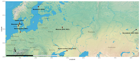 According to the results of the CoVs’ RdRp sequences identity analysis, sequences obtained from the Rostov region had identity above 90% with sequences from the Novosibirsk region from this study, and also with alphaCoVs records from Moscow in 2015 (OR241431.1, OQ725985.1, OQ725982.1, OQ725981.1) and 2021 (OR052077.1, OR052073.1) and Rostov region in 2021 (OR052075.1) from Korneenko et al. [27] study, from Denmark, Vadum in 2014 (MZ218060.1) from Lazov et al. [40] study, from Finland, Mustasaari in 2016 (MG923574.2, unpublished study), and from Germany, Bad Segeberg in 2007 (EU375869.1 and EU375864.1) [41]. AlphaCoVs’ sequences from the Novosibirsk region shared the same identity higher than 90% with the above-written records, except for records from Finland. Additionally, sequences from Novosibirsk had >90% identity with a previously unmentioned record from Moscow in 2015 (OQ725984.1) from Korneenko et al. [27] study and with the record from Denmark, Moensted in 2016 (MN535734.1) from Lazov et al. [40] study. All sequences from these records were obtained from bat-derived samples (Figure 3). Also, interestingly, alphaCoV’s RdRp gene sequence obtained from RNA extracted from P. kuhlii fecal sample collected in 2023 in Rostov region from our study (PQ439331.1) was 100% identical to the record of the same gene sequence detected in the fecal sample of the same bat species in 2021 (OR052075.1) from Korneenko et al. [25] study. The geographical representation of locations with the records of alphaCoVs that shared identity above 90% based on RdRp sequences is shown in Figure 4.