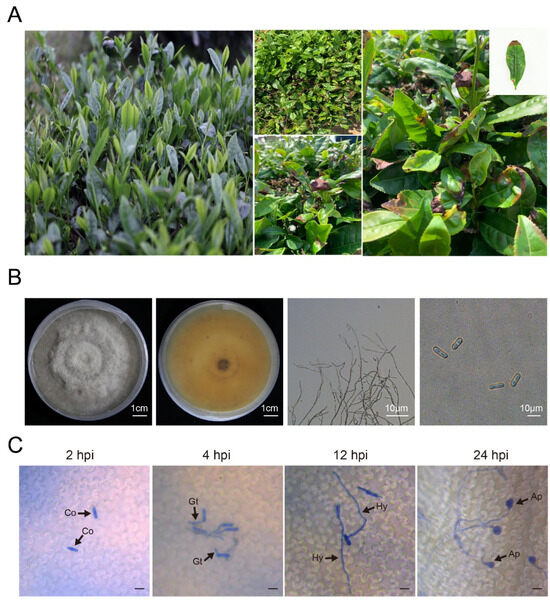 The purified pathogenic fungus was inoculated onto the ‘Longjing43’ leaves to observe the subsequent development of the infection process on the tea tree leaves using aniline blue staining. The results demonstrated the presence of rod-shaped spores at 4 hpi. Spore germination tubes were observed at 8 hpi, followed by the appearance of hyphae after 12 hpi. The formation of appressorium was detected at 24 hpi (Figure 1C).