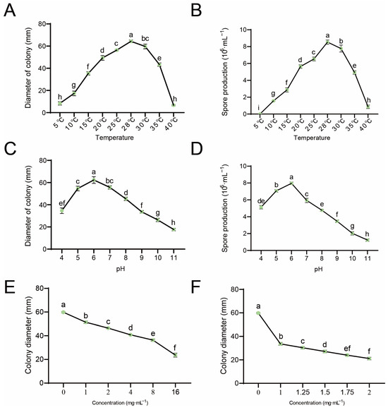The effect of pH value on C. gloeosporioides was investigated. The results demonstrated that the mycelia exhibited normal growth within a pH range of 5–9, particularly with the most rapid growth at pH 6. Its colony diameter reached 62.33 mm with an average growth rate of about 12.47 mm d−1. However, the mycelial activity was found to be poor, and the growth rate was slow under pH 10 and pH 11. After 5 days, the colony diameters measured 26.33 mm and 17.67 mm, with average growth rates of 5.27 mm d−1 and 3.53 mm d−1, respectively (Figure 2C). The maximum spore yield reached 7.97 × 105 CFU mL−1 at pH 6, while the sporulation of the strain significantly decreased after pH 9, with a minimum sporulation of only 1.23 × 105 CFU mL−1 (Figure 2D).