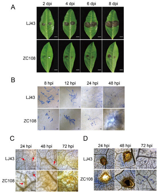 The C. gloeosporioides were inoculated onto ‘Longjing 43’ and ‘Zhongcha 108’ leaves, aiming to investigate the response of different tea plant varieties with varying resistance levels towards C. gloeosporioides.
