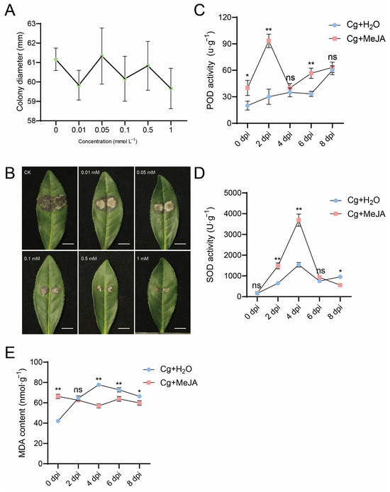 Effect of exogenous hormone treatment on Colletotrichum gloeosporioides. (A) Effect of exogenous MeJA on mycelial growth of Colletotrichum gloeosporioides. (B) Leaf phenotypes at 5 d exogenous MeJA treatment followed by inoculation with Colletotrichum gloeosporioides. (C) Peroxidase (POD) activity of ‘Longjing 43’ leaves after inoculation with Colletotrichum gloeosporioides. (D) Superoxide dismutase (SOD) activity of ‘Longjing 43’ leaves after inoculation with Colletotrichum gloeosporioides. (E) Malondialdehyde (MDA) content of ‘Longjing 43’ leaves after inoculation with Colletotrichum gloeosporioides. Note: Data with three biological replicates were introduced as mean values ± standard deviation (*, p < 0.05; **, p < 0.01), “ns” means no difference.