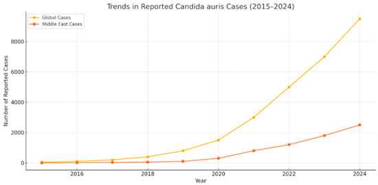 Trends in reported C. auris cases globally and in the Middle East from 2015 to 2024 [21].