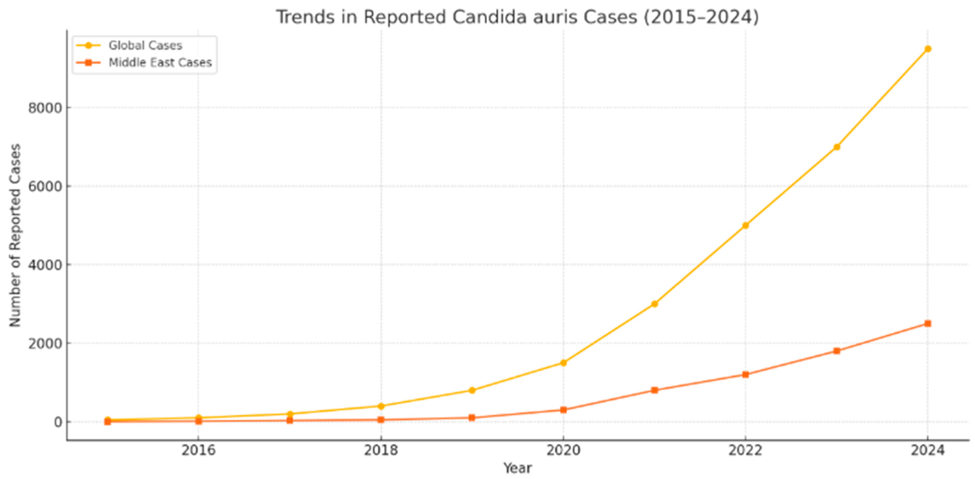 Figure 2. Trends in reported C. auris cases globally and in the Middle East from 2015 to 2024 [21].