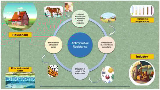 - Magnano San Lio, R.; Favara, G.; Maugeri, A.; Barchitta, M.; Agodi, A. How Antimicrobial Resistance Is Linked to Climate Change: An Overview of Two Intertwined Global Challenges. Int. J. Environ. Res. Public Health 2023, 20, 1681. [Google Scholar] [CrossRef] [PubMed]