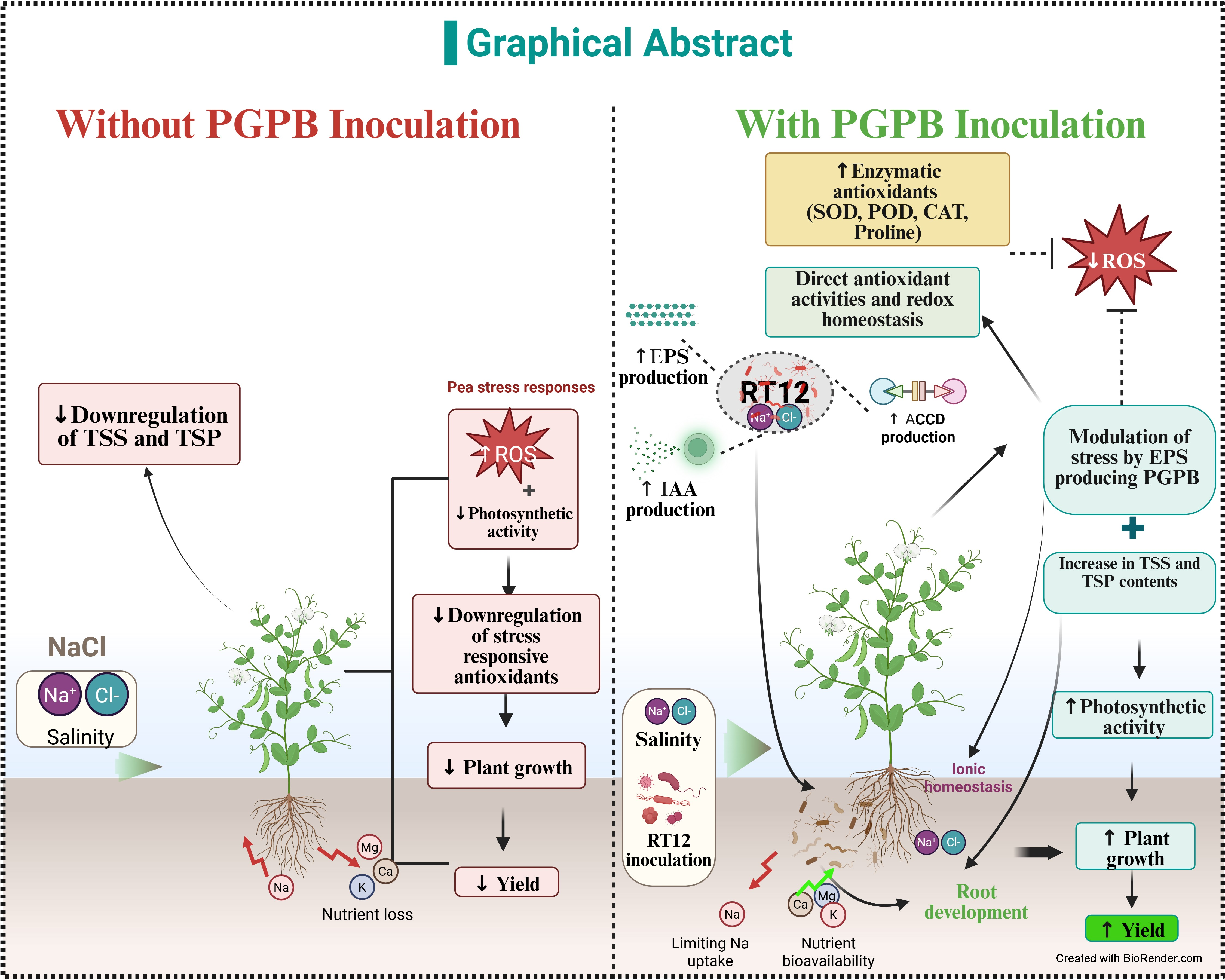 Khan AA, Alabbosh KF, Kashif, Iqbal B, Manan S, Alhoqail WA, Du D-L, Wang Y-F. Ion Homeostasis, Osmotic Adjustment, and ROS Detoxification Underlie Pea Salinity Tolerance Induced by Pseudomonas putida RT12. Microbiology Research. 2025; 16(11):227. https://doi.org/10.3390/microbiolres16110227