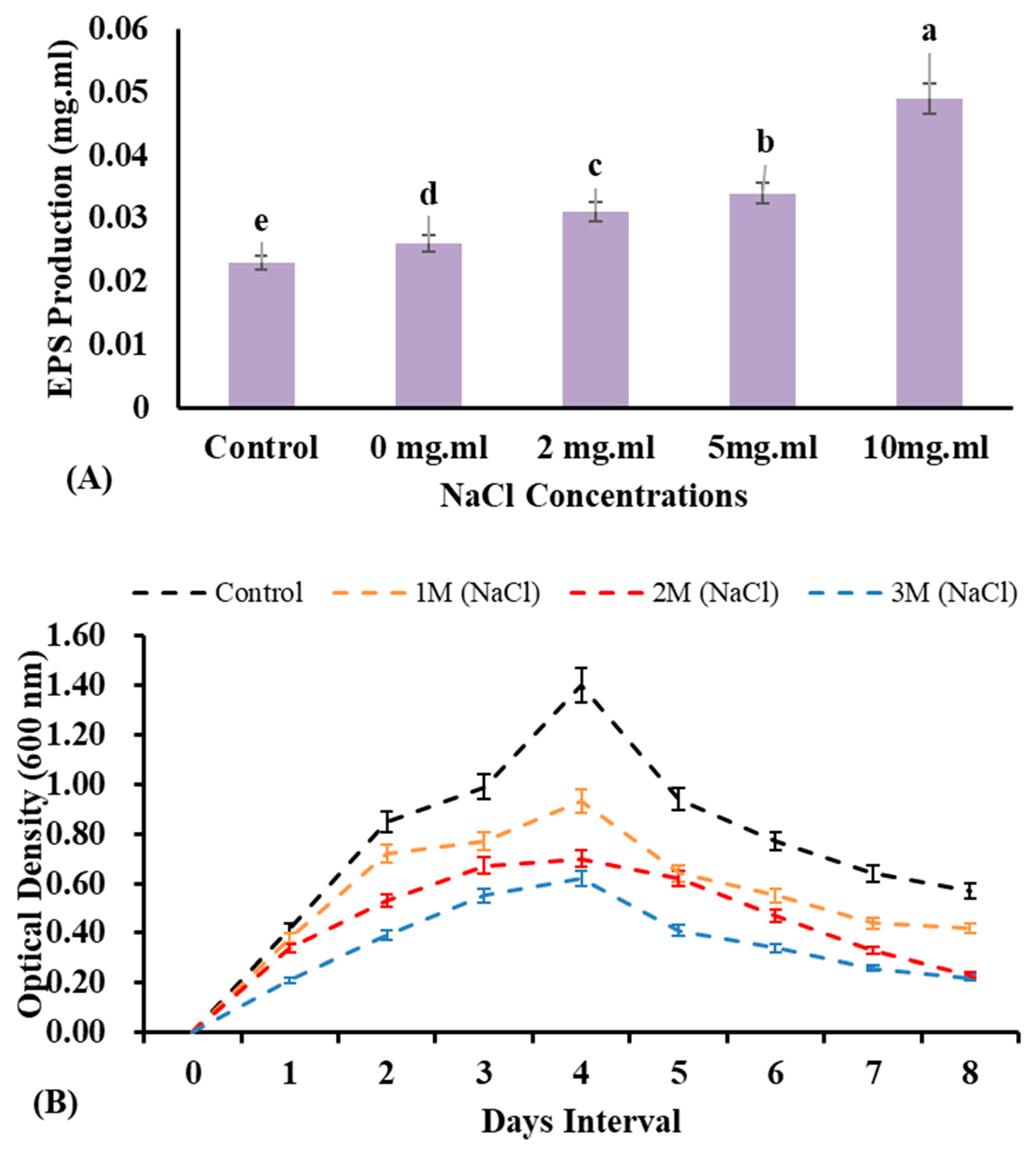 3.1. Initial Screening of Strains for Halotolerance and EPS Production