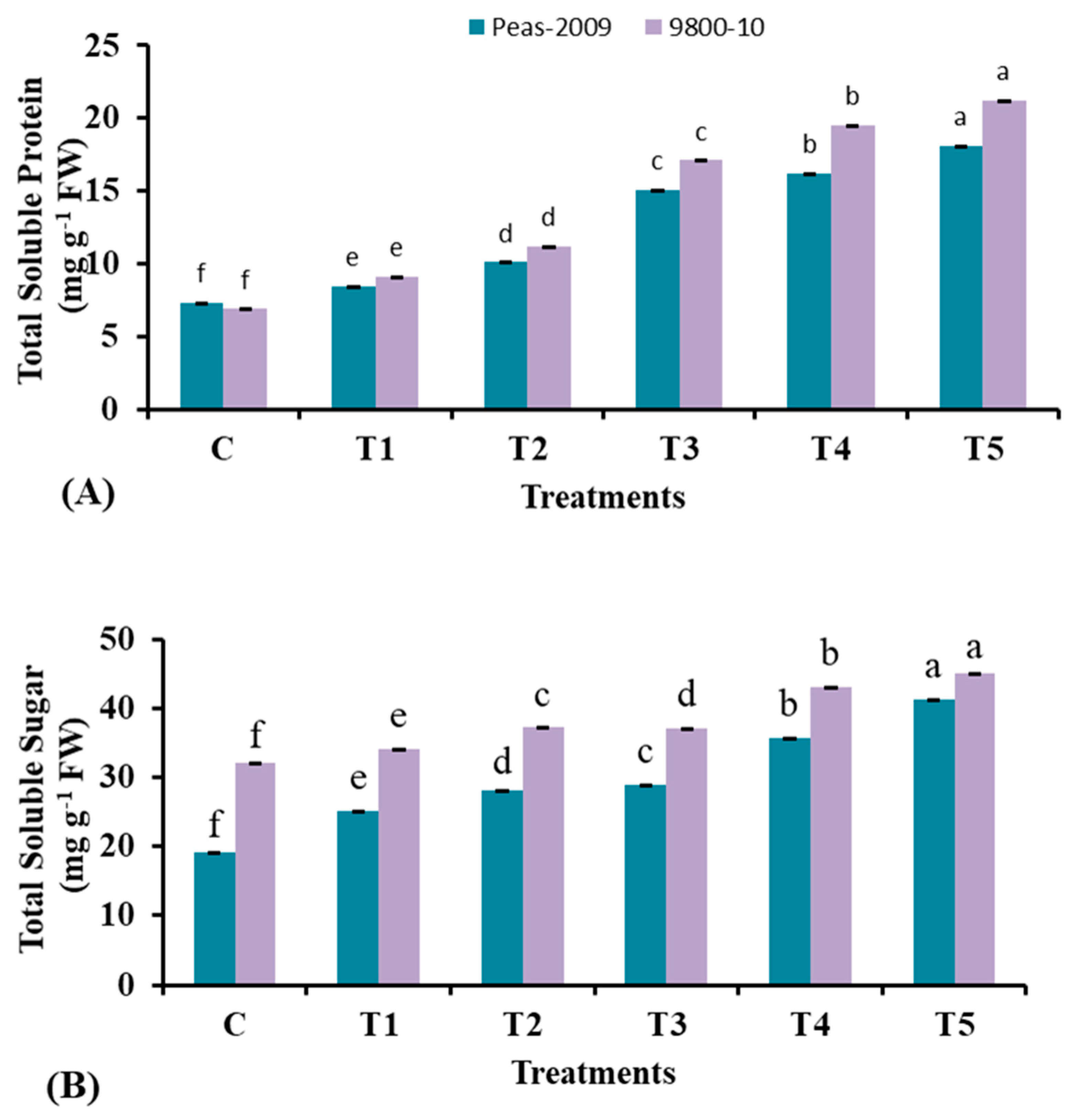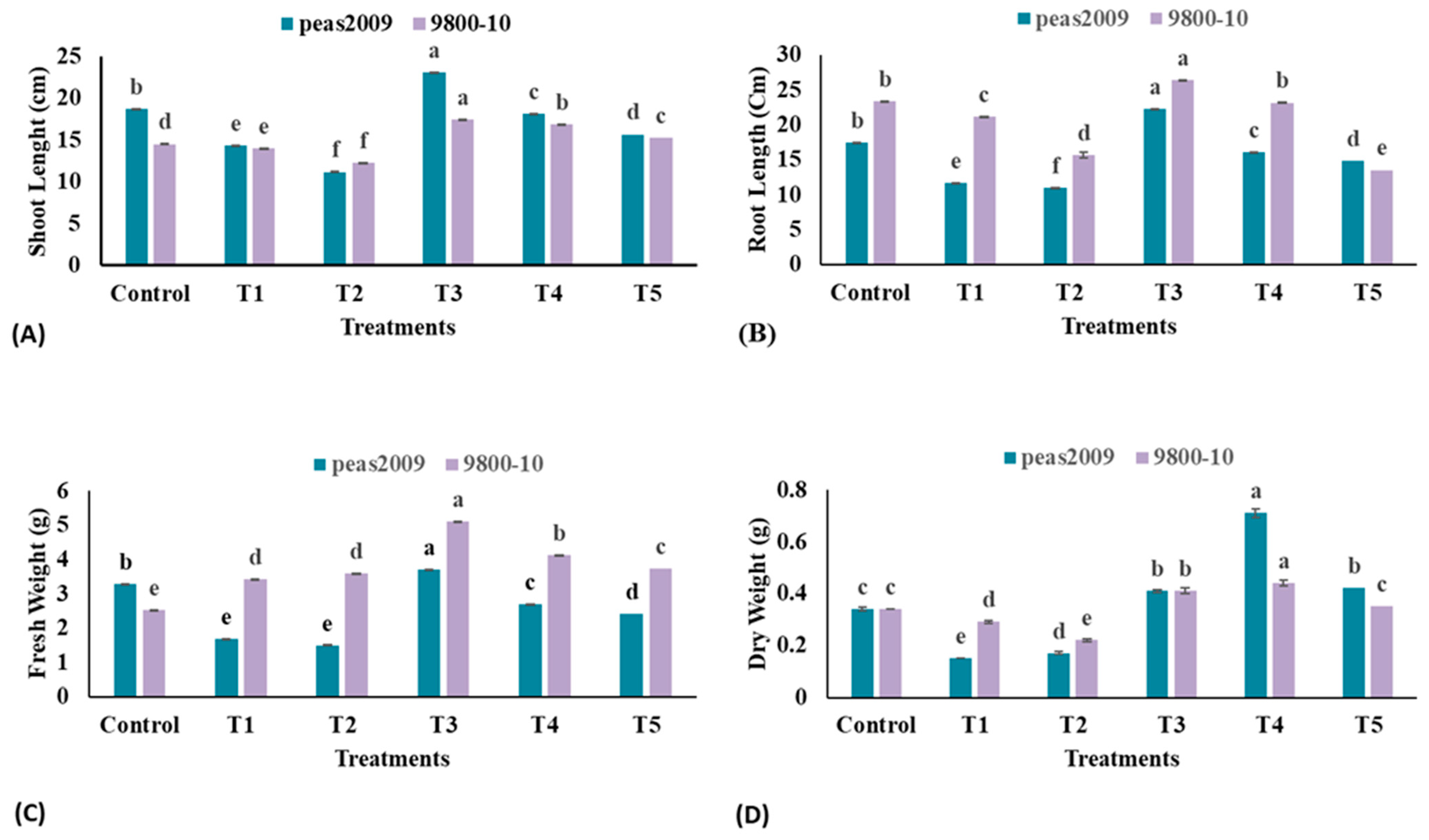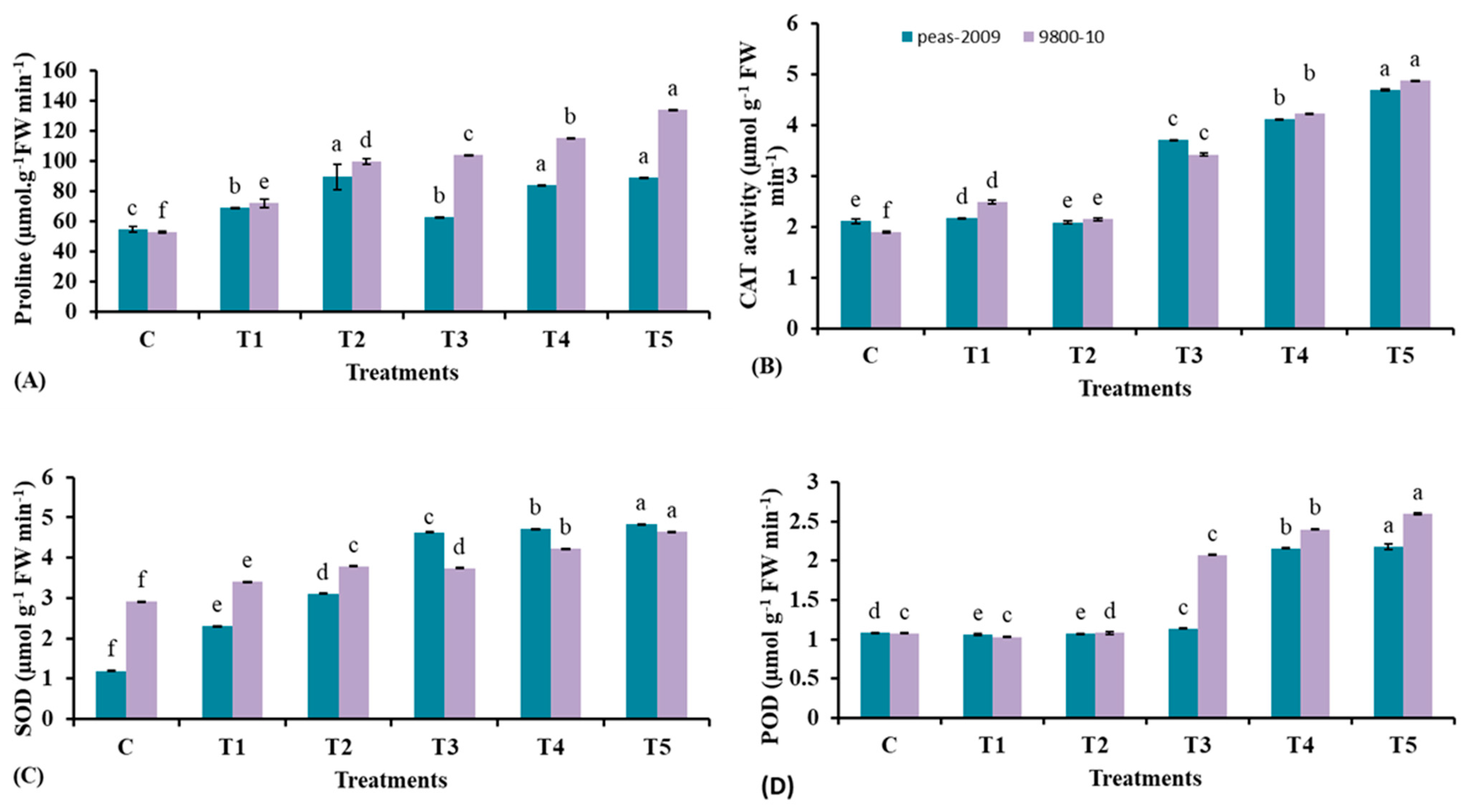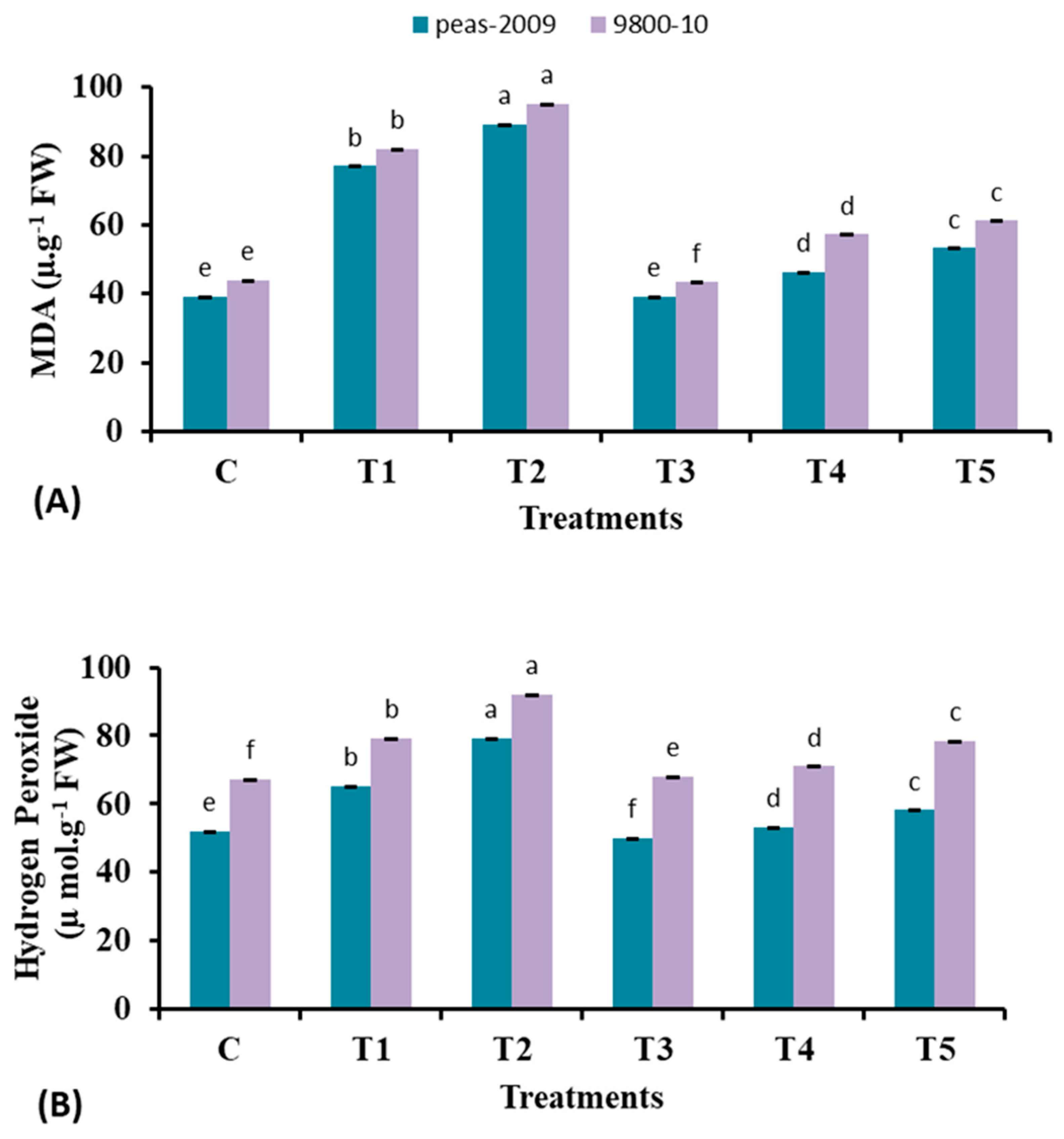 - Farooq, M.; Ahmad, R.; Shahzad, M.; Ahmad, K.; Sajjad, Y.; Hassan, A.; Nazir, A.; Shah, M.M.; Kalsoom, B.; Khan, S.A. Evaluation of morphological and biochemical variations in peas under two widespread abiotic stresses. Acta Physiol. Plant. 2024, 46, 109. [Google Scholar] [CrossRef]