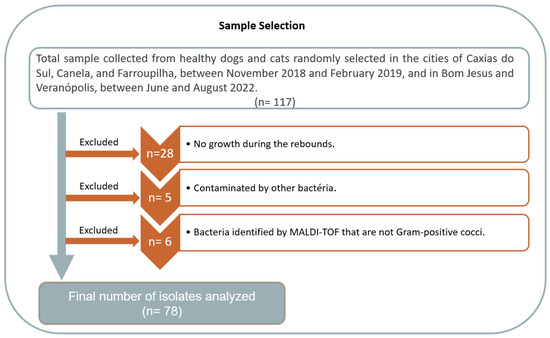 In Brazil, few studies have investigated Staphylococcus spp. from the microbiota of companion animals (highlighting dogs and cats) [22,28,29,30]. The present study aimed to determine the diversity of the Staphylococcus species and to evaluate the AMR in a sample of healthy dogs and cats from southern Brazil.