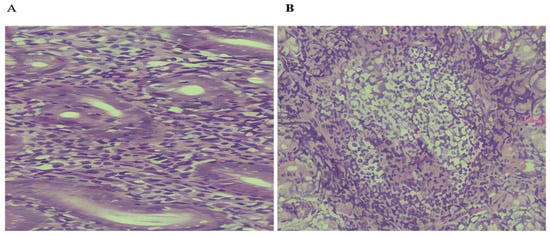 Histopathological details of gastric tissue using H&E staining: (A) gastric antral biopsy reveals mild chronic gastritis with mild to moderate activity; (B) the gastric antrum revealed moderate chronic gastritis with lymphoid follicles.