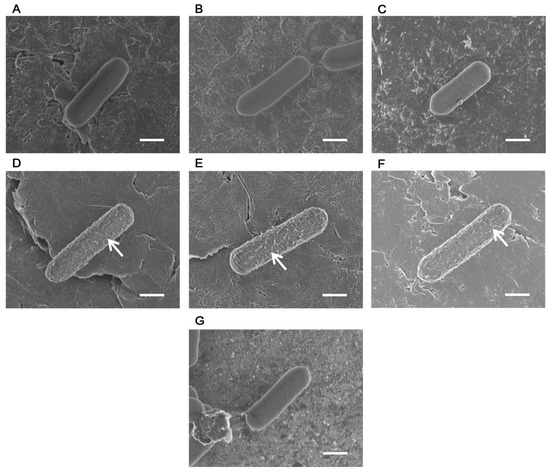 - Amako, K.; Umeda, A. Bacterial surfaces as revealed by the high resolution scanning electron microscope. J. Gen. Microbiol. 1977, 98, 297–299. [Google Scholar] [CrossRef]