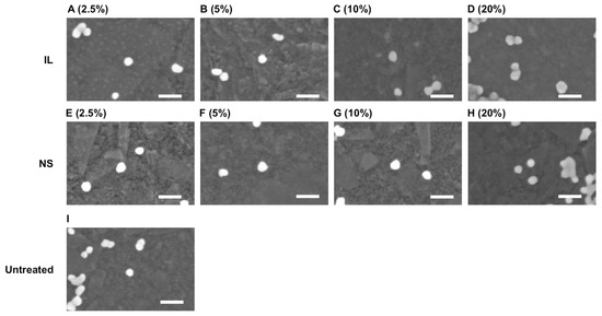 Field emission scanning electron microscopy images of the silica particles. Surface morphology of the silica particles, which were prepared by the control, ionic liquid (IL), and NanoSuit® (NS) methods, exhibited no clear differences. (A–D) IL method; (E–H) NS method; (I) untreated. Liquid concentrations are shown in parentheses. Scale bars: 60 nm.