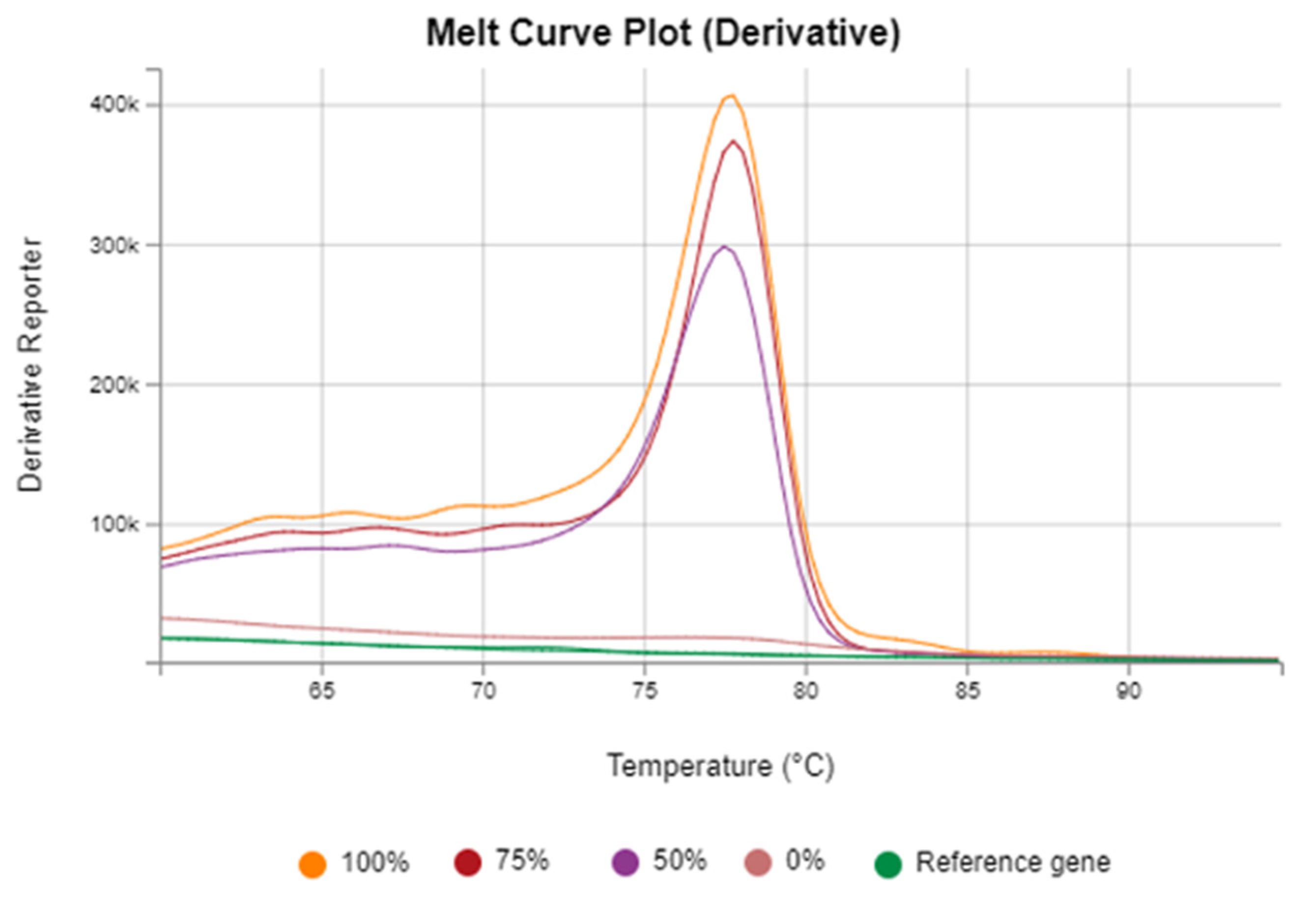 Figure 1 below represents a melt curve analysis of standard and reference genes showing distinct peaks corresponding to 0%, 50%, 75%, and 100% methylation levels, prepared from mixtures of fully methylated and unmethylated control DNA. During optimization, the reference gene (ACTB) consistently aligned with the 0% methylated standard, confirming assay specificity. These standards were therefore used to calibrate the HRM assay. The clear separation of curves confirms the assay’s ability to discriminate between different methylation levels, validating the experimental conditions.