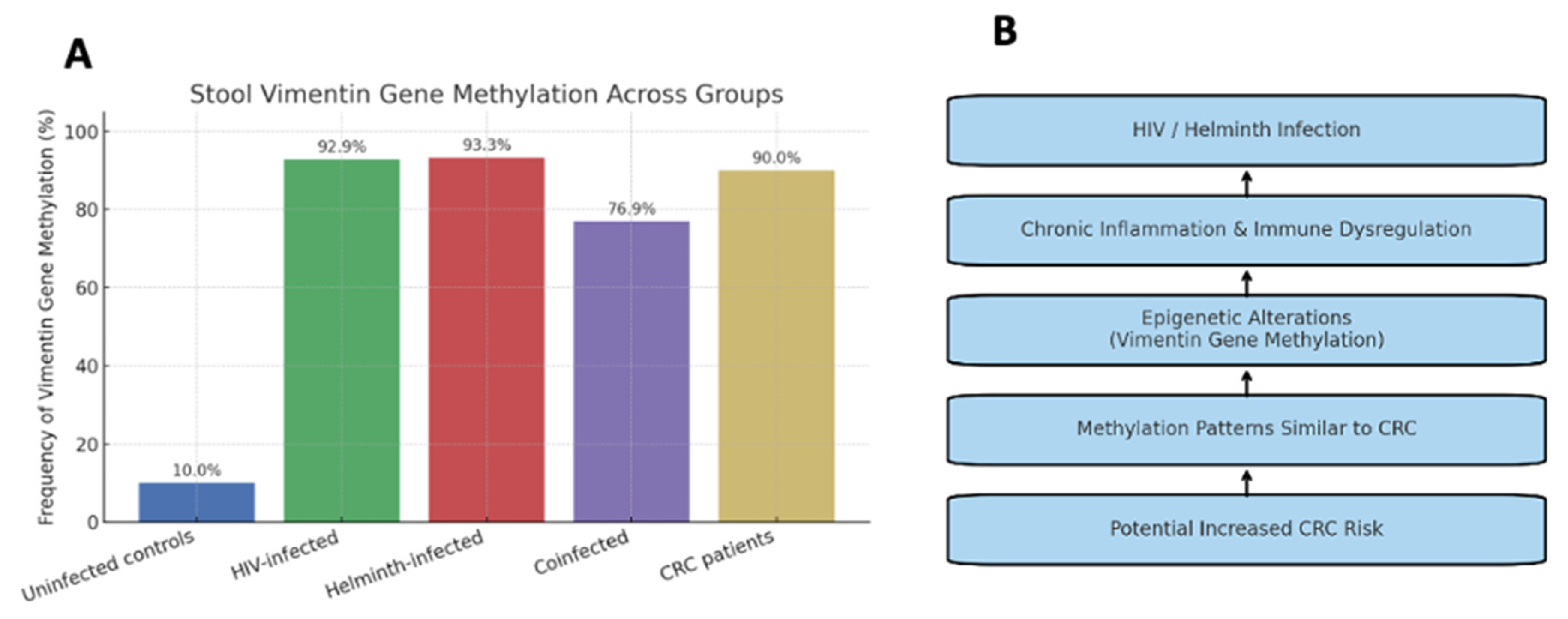 Figure 2. Correlation of Vimentin Methylation Patterns with Colorectal Cancer and Chronic Infections. (A) Stool vimentin methylation was observed in HIV-, helminth-, and co-infected individuals, at frequencies comparable to colorectal cancer patients. Although further studies are needed to confirm this, it is important to note that these observations suggest that chronic infection-associated methylation signatures might overlap with those previously described in colorectal cancer, posing challenges for cancer screening in regions endemic for infection. (B) This infographic summarizes how chronic infections like HIV and helminths cause inflammation and immune disruption, leading to vimentin gene methylation patterns similar to those in colorectal cancer patients. It highlights the potential link between infection-driven epigenetic changes and cancer risk, emphasizing the need for combined infection and cancer prevention efforts.