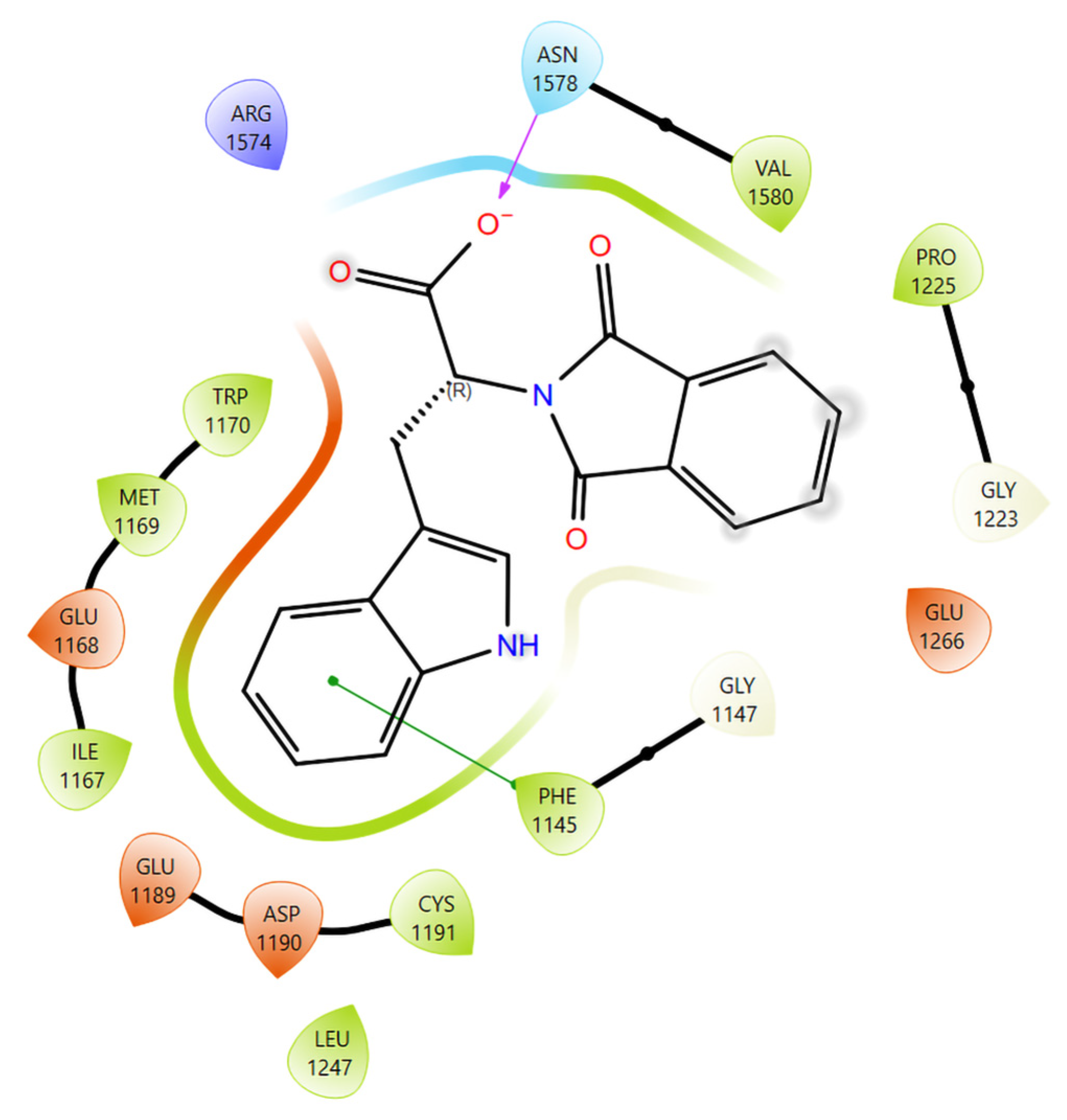 The 2D interaction diagram (Figure 4) confirmed these contacts: green lines mark hydrogen bonds to Glu1266 and Asn1578; a violet line indicates π–π stacking with Phe1145; and shaded regions denote solvent exposure around Glu1168, Glu1189, and Asp1190. This configuration shows a partially buried aromatic core with a solvent-accessible hydroxamate terminus. The Prime MM-GBSA calculation produced a ΔG_bind of −49.61 kcal mol−1, confirming a strong and energetically favorable complex. Major residue contributions were Glu1266 (−5.84), Asn1578 (−4.19), Phe1145 (−3.71), Pro1225 (−3.26), Cys1226 (−2.88), Trp1170 (−2.33), and Arg1574 (−1.95) kcal mol−1 (Table 4).