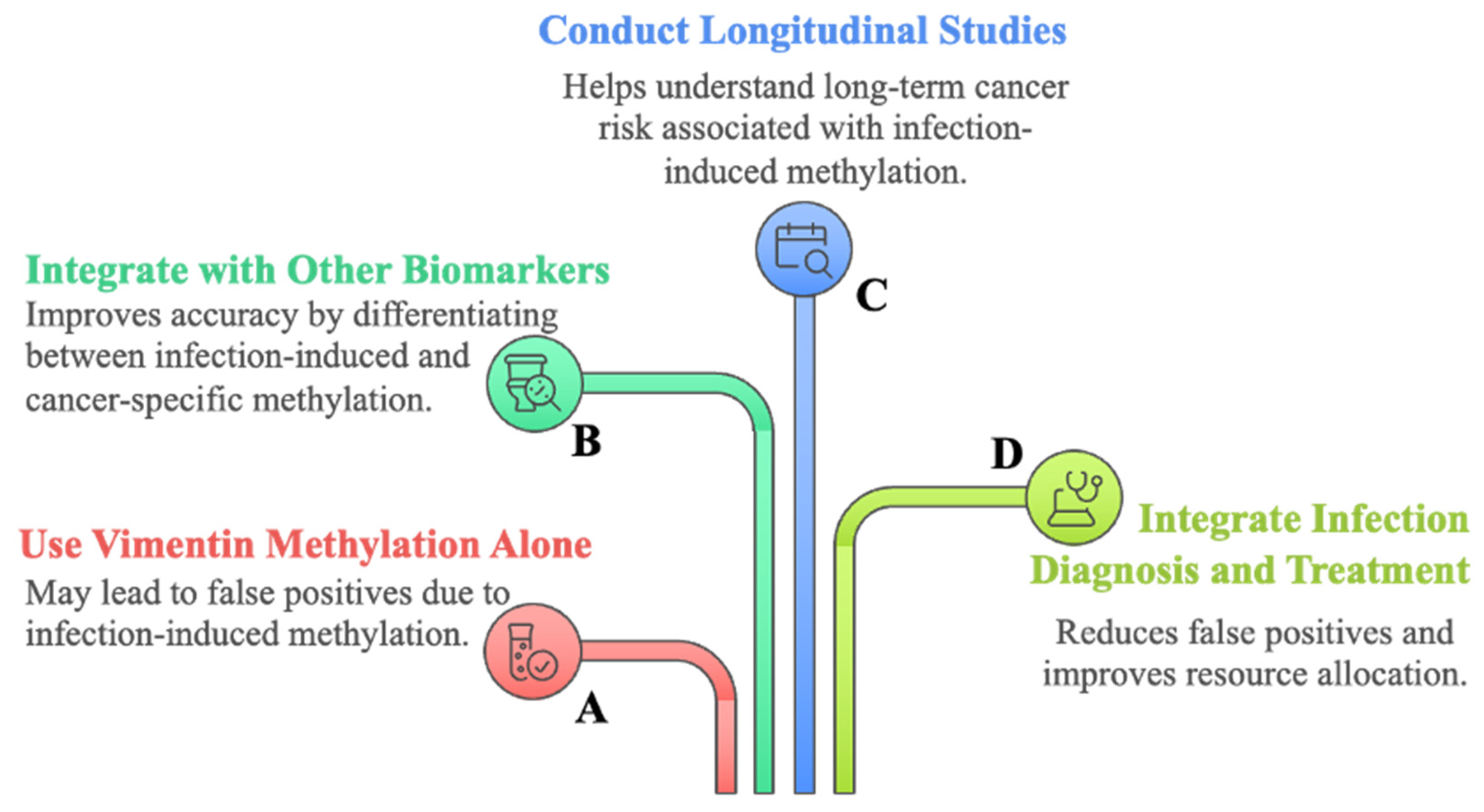 Figure 5. Concluding Figure. Conceptual framework for CRC screening in populations with high HIV and helminth prevalence based on vimentin methylation status. The schematic illustrates different approaches for interpreting stool-based vimentin methylation results. (A) Using vimentin methylation alone may result in false positives due to infection-induced methylation in HIV- and helminth-infected individuals. (B) Combining vimentin methylation with other CRC-specific biomarkers enhances screening accuracy by distinguishing infection-induced epigenetic changes from malignant alterations. (C) Integration with infection diagnosis and treatment helps reduce false positives, ensuring appropriate resource allocation. (D) Conducting longitudinal studies in infected populations allows assessment of long-term CRC risk associated with infection-driven methylation, guiding targeted surveillance strategies. This framework emphasizes the need for a multifaceted approach to early CRC detection in high-risk, infection-burdened regions.