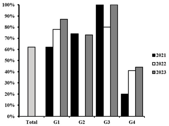A higher percentage of contamination was detected on G3, followed by G1 and G2. The group with the lowest incidence of contamination was G4 (Figure 1). From the total of samples classified into G1, 62% were positive in 2021, 66% in 2022, and 70% in 2023. In the case of G2, 74% were positive in 2021 and 73% in 2023. Additionally, with higher percentages of contamination, G3 exhibited 100%, 80%, and 100%, in 2021, 2022 and 2023, respectively. Finally, G4, with the lower percentages of contamination, revealed 20% in 2021, 41% in 2022, and 44% in 2023. Importantly, after the genotypic identification of the virulence genes, the authors identified the presence of genes related to the pathogenic mechanisms of UPEC, ETEC, and DAEC.