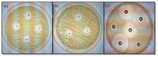 Evaluation of the antimicrobial activity of M. oleifera seed extracts against the multidrug-resistant E. coli isolated from food samples, (a) G1-23 and (b) G4-22. Combination of M. oleifera with six antibiotics (c). Triplicates are marked with capital letters (A, B, C), and methanol 20% was used as negative control (ctl-). Antibiotics are numbered as follows: (1) levofloxacin, (2) ciprofloxacin, (3) nalidixic acid, (4) chloramphenicol, (5) amoxicillin/clavulanic acid, and (6) gentamicin.